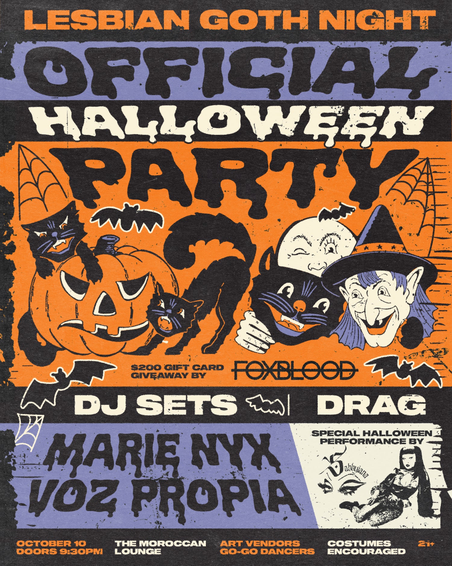 Founded in 2023, Lesbian Goth Night is a sapphic and queer sanctuary where goth, post-punk, dark wave, and EBM pulse through the dark. We bring diverse styles and misfits together to celebrate — embracing authentic expression in fashion and makeup, and connecting deeply through the music’s intensity — culminating each year in our biggest celebration, Goth Pride.